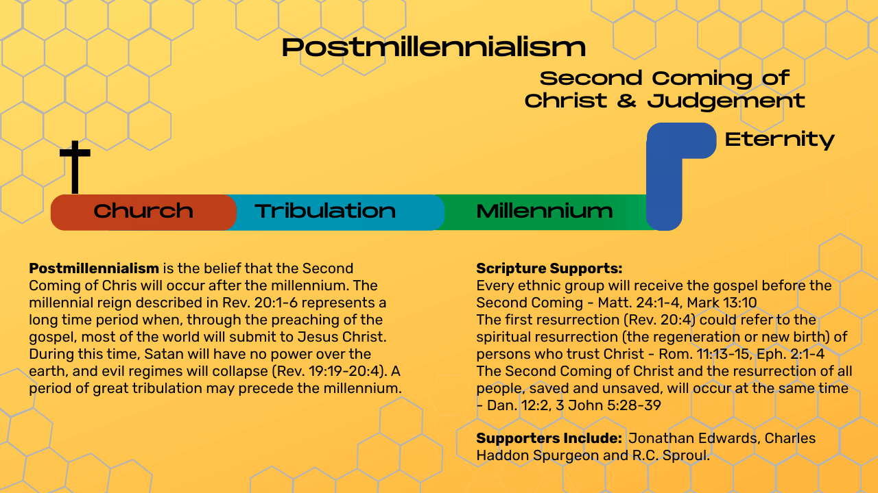 The "post" in postmillennialism means Christ's coming follows this era of growth. His return still marks the end of history and the inauguration of the eternal state, but it comes after the kingdom has advanced through the church rather than before.